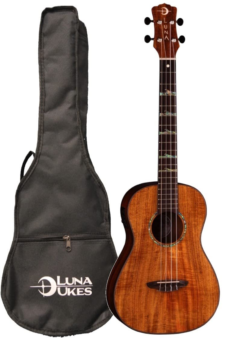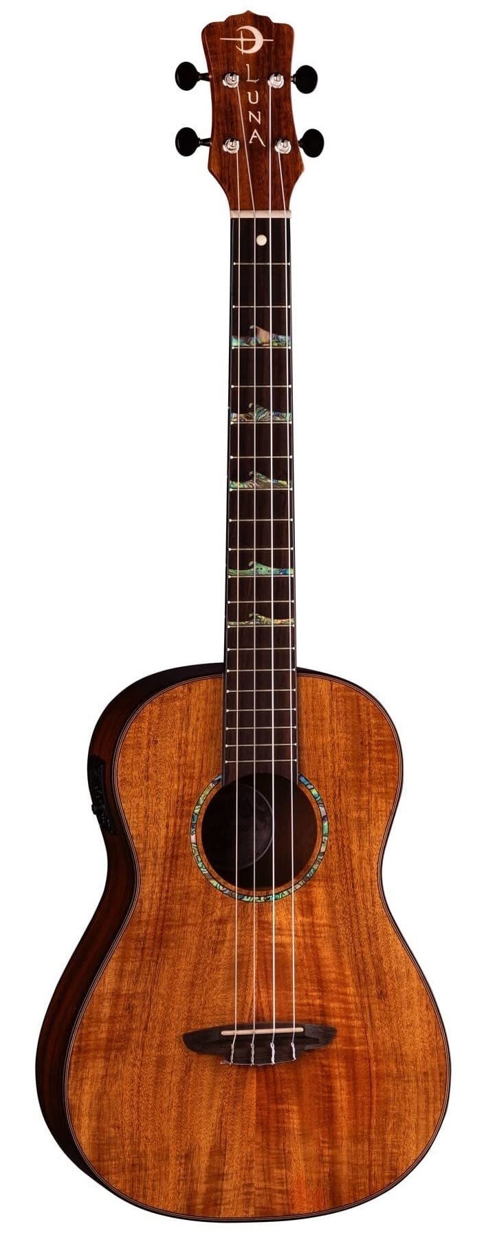 Details: Stunning Concert Ukulele from Luna Celebrates the Moon With the High Tide Koa Baritone Acoustic-electric Ukulele from Luna, you’re getting a stunning, truly unique instrument. This gorgeous uke features a koa body and top that will captivate you and your audience with its lush brown-and-red striped pattern grain and stellar tone. A mahogany neck with pau ferro fingerboard is instantly playable and comfortable — ideal for exploring various uke chord voicings up and down the neck. And when you are ready to plug in, onboard Luna UK-T2 electronics deliver wonderful amplified ukulele tone. Here at GearNuts, we appreciate the onboard tuner included in the UK-T2 that makes staying in tune easy whether you are onstage or at the beach!Captivating neck with great playability The High Tide Koa celebrates the moon phases with stunning abalone inlays that depict the naturally rising tide that correlates to the moon’s push and pull on